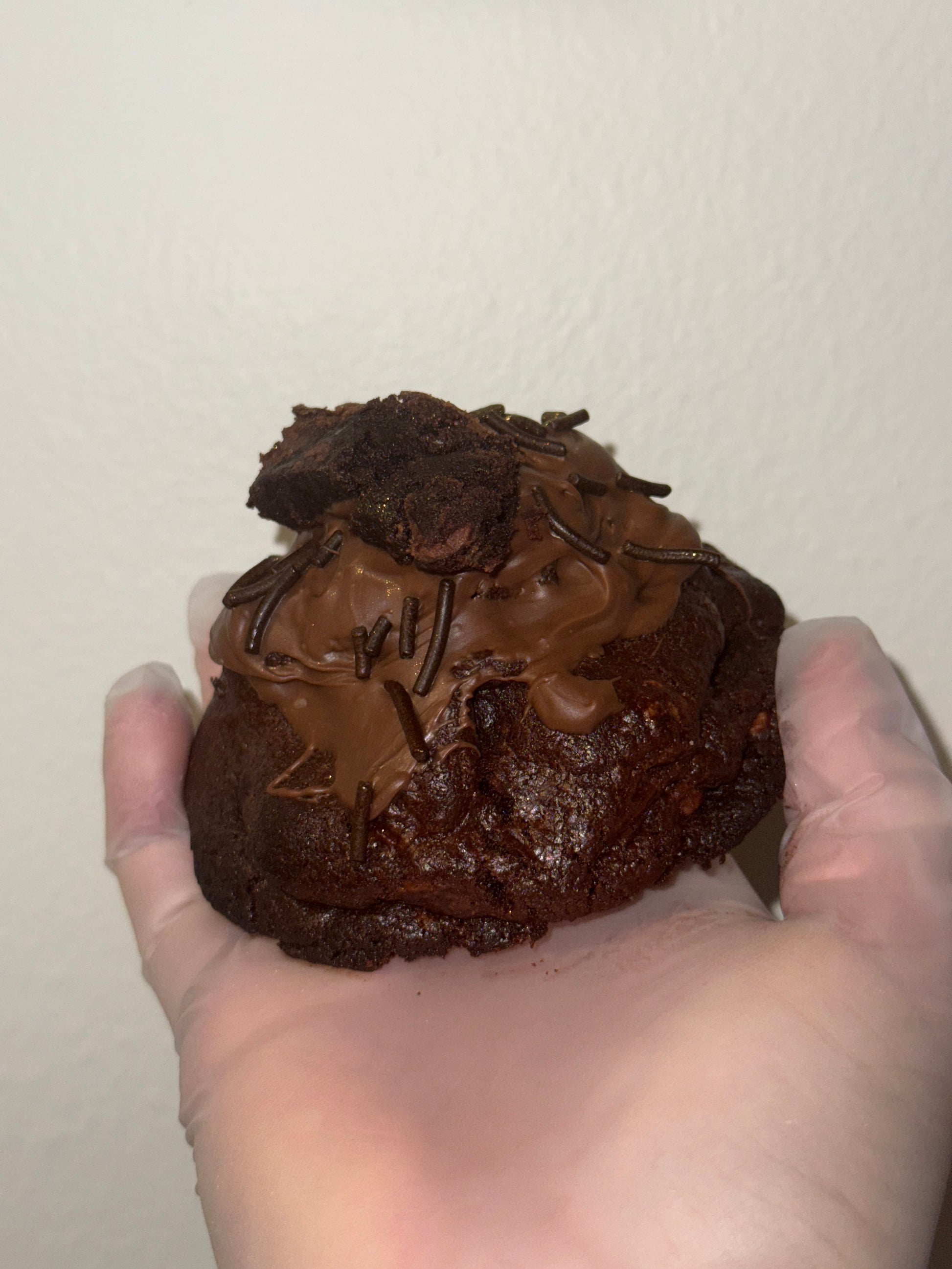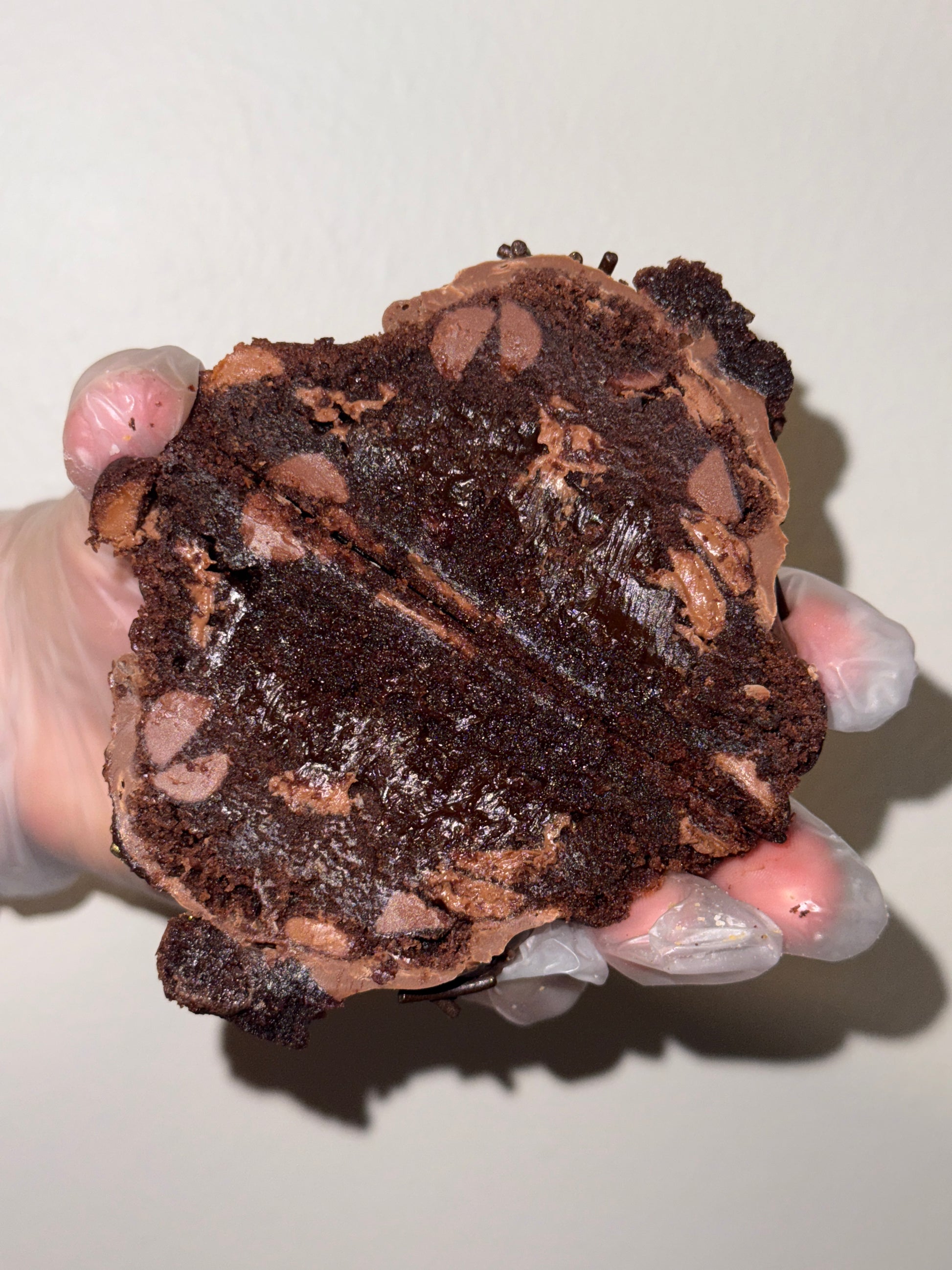 Doble chocolate dough filled with homemade brownie piece & fudge